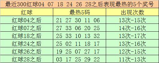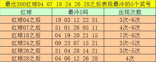 红球冷码统计:双色球第2025105期开出红球奖号分别为:04、07、18、24、26、28,在最近300期开奖中,各号码出现之后其下期出现最少的5个红球分别为: