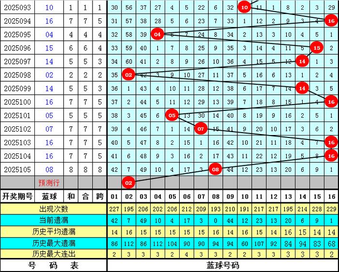 上期开出蓝球号码08,该号码在最近300期中出现了16次,其下期分别开出:蓝球11、12出现3次,蓝球06、15出现2次,蓝球01、04、08、09、13出现1次,蓝球02、03、05、07、10、14、16出现0次。本期五码蓝球参考02、03、04、05、16,独蓝关注02。